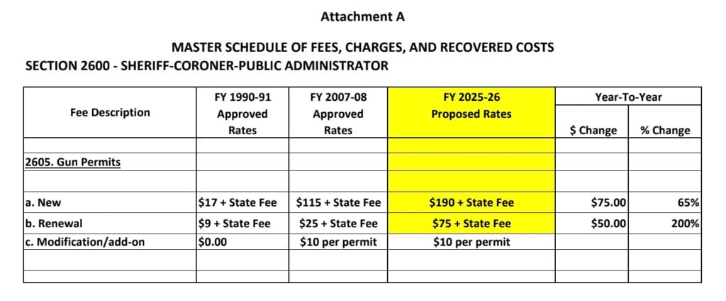 On October 21, 2025, the Board voted to amend the county’s Master Schedule of Fees for the Sheriff-Coroner-Public Administrator’s Office. The changes include a 65% increase for new CCW permits — from $115 to $190 plus state fees — and a 200% increase for renewals, which will now cost $75 plus state fees. The modification or add-on fee remains at $10 per permit.