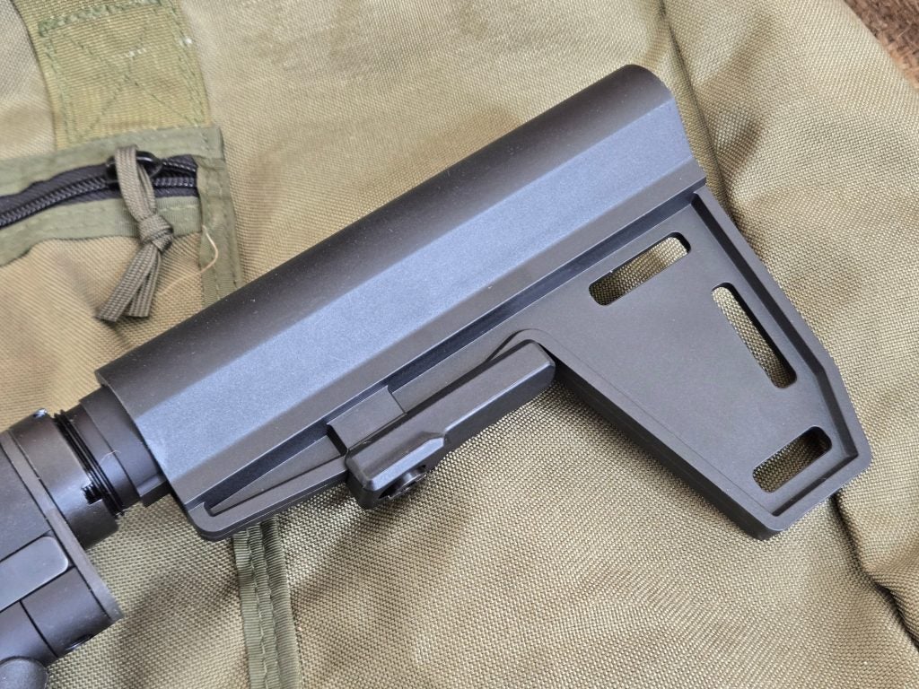 Either way, the point is this thing folds down small and is easy to store and carry. Equally important, it’s quick to get back into action. The brace doesn’t lock in the closed position, which I kind of wish it did. The up side though is that it’s very fast to deploy. So that may have been a conscious choice by Foxtrot Mike. Simply swing the brace open and it locks into place. Once locked it feels as solid as any fixed receiver extension.