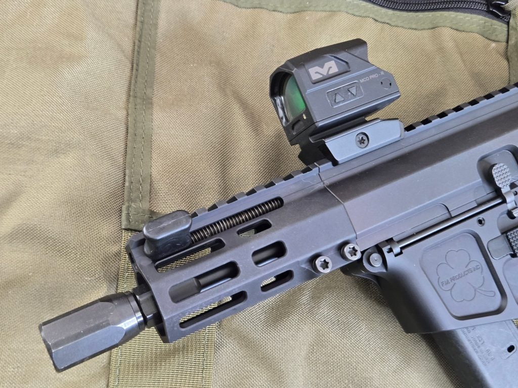 While the lower is above average in features, things start getting interesting with the VFM-9 upper. The upper isn’t your same old AR upper either. My VFM-9 is fitted with a 5.2-inch 41V50 steel barrel. It’s threaded 1/2-28 and comes fitted with FM’s Micro Blast Diffuser. The barrel rated for a service life exceeding 10,000 rounds. That’ll take a while to wear out. Rather than a traditional barrel nut, the VFM-9 uses a thermal-fit barrel design, which reduces weight and cost, while preserving accuracy. The streamlined MLOK handguard attachment cuts fasteners from eight down to two, simplifying assembly without sacrificing rigidity.
