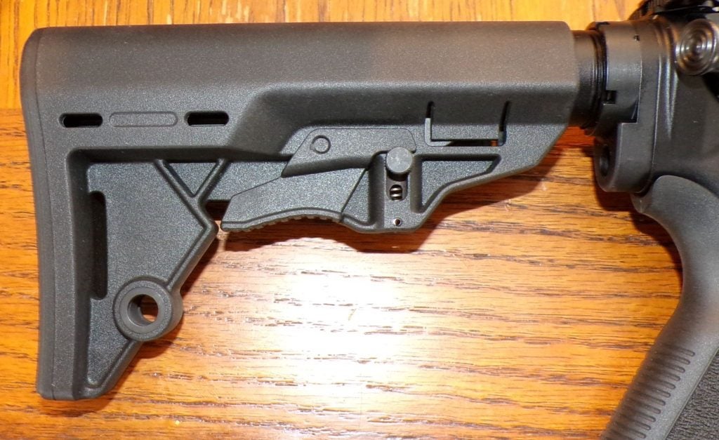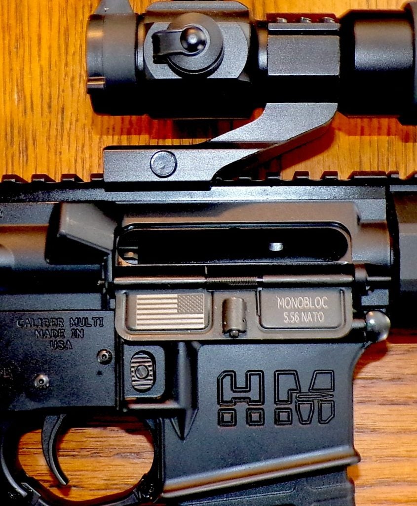 Also note the 20-round mag. The rifle comes with a 30-round magazine, but I prefer the shorter one for bench shooting or everyday use. It’s a good balance between the longer mag and the very short 10-rounder. I do see the advantage of a 10-round mag; here in Indiana, you can use an AR to hunt deer, but you are limited to 10 rounds. Show the game warden your 10-rounder, and you’re good to go, no questions.