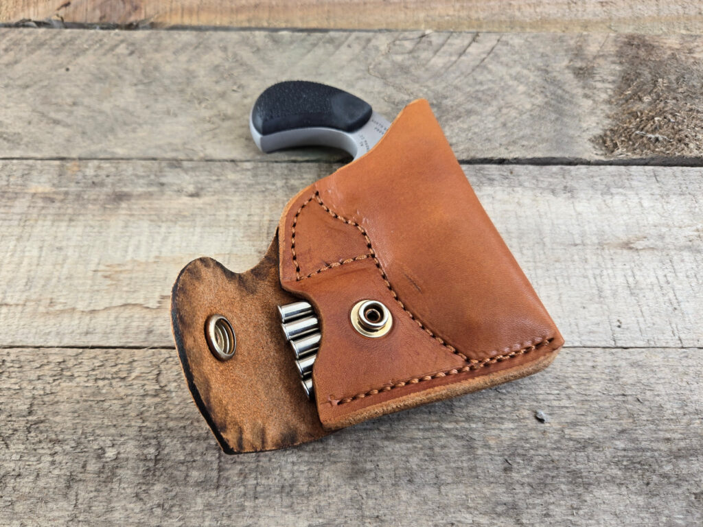 I ended up with a tan leather model that holds the gun upright in your pocket. It has an extended flange that breaks up the lines of the holster and keeps the gun oriented in the correct position in the pocket. It also includes a pouch that holds an extra 5 rounds of ammo.