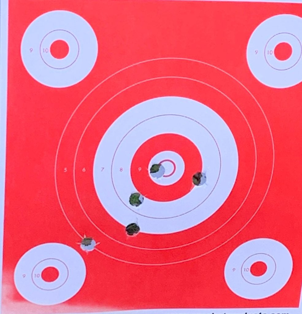 This target of the 240-grain JHP is unique… we see three holes, but he shot 5 times. I wouldn’t think he went over the target, but you never know… at least there are three holes! This was about all the shooting his hands could stand… prodigious recoil!