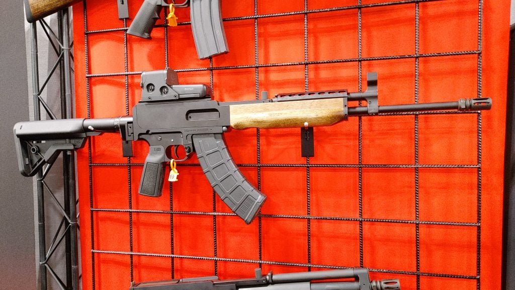 Hydra Weaponry is owned by Mack Gwinn’s son, and a few years back, they released the arm pistol alongside their modular AR design. This year, they brought the Bushmaster rifle to the show. They’ve created both a wood-stocked, iron-sight-equipped replica of the original in 5.56 and a more tactical model.