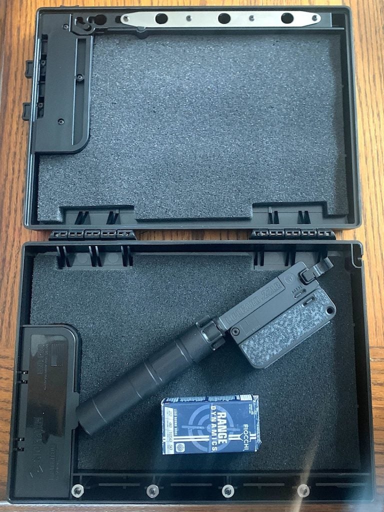 I put my LifeCard folding single-shot .22 with a Griffin Armament suppressor, and a box of ammo in the box to show one possible use. If you have a semi-auto or a revolver that you would like to access quickly, this box should work. If you have a compact, you might want to look at a compact box. It’s a bit smaller and cheaper.