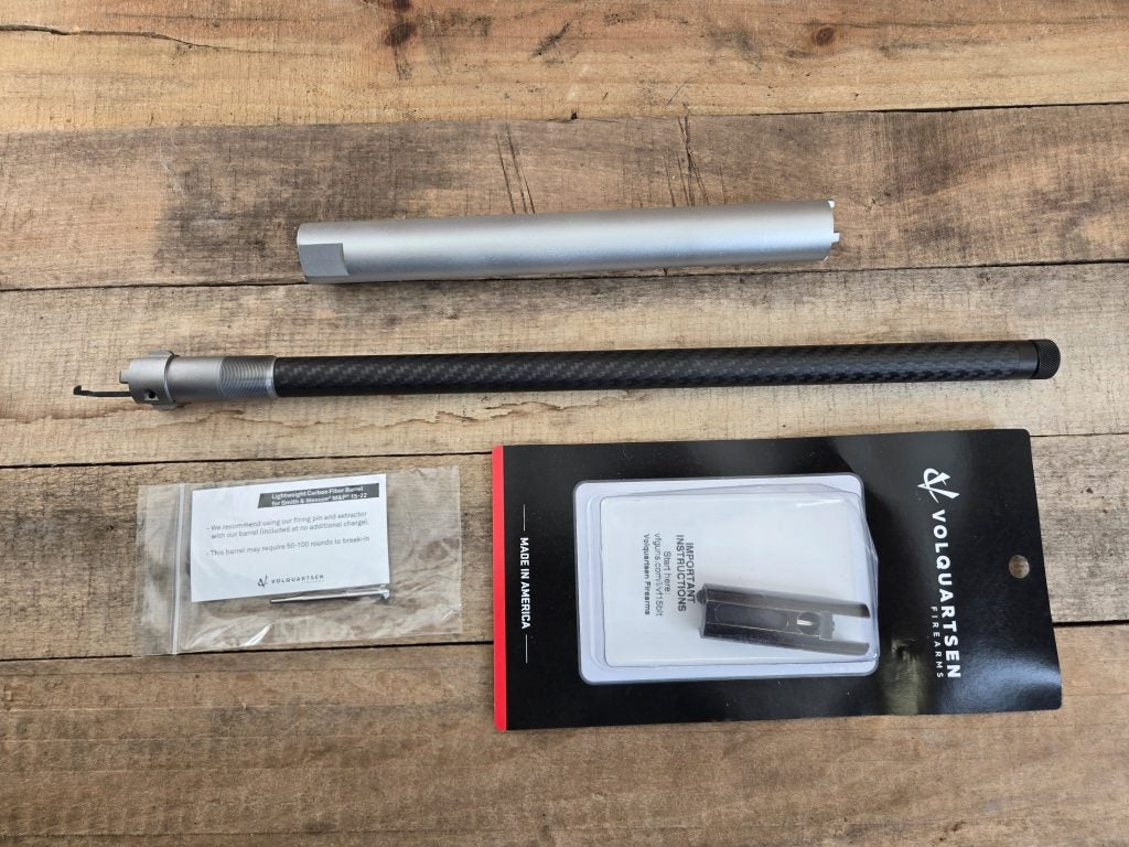 This bundle includes Volquartsen’s Lightweight Carbon Fiber barrel and Competition Bolt. The THM tension barrel includes a special taper-honed match barrel and chamber. Their Competition Bolt is precision machined, DLC coated, and includes our SureStrike Firing Pin and Exact Edge extractor. The kit is available with a compensator, but since I planned on running a can I opted for the kit with just a threaded barrel and thread protector instead. The kit includes a barrel wrench to swap out your factory barrel. I did get some pare parts to rebuild my old bolt too, just as a spare. MSRP on the kit as I got it is $475. It’s $546 if you want the compensator. All of the components are made in the USA.